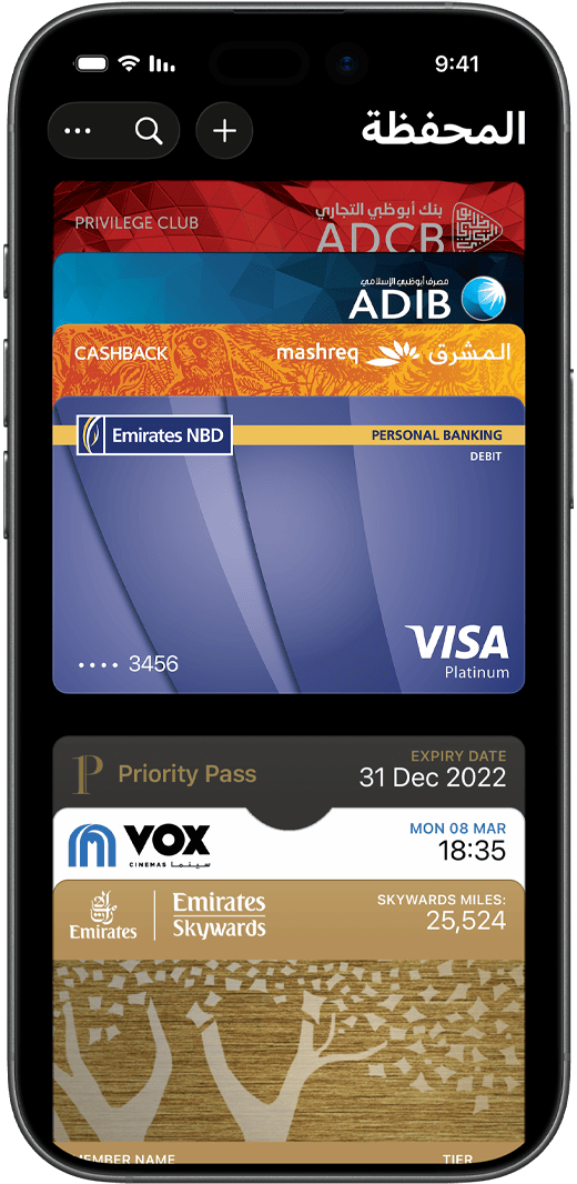 • تطبيق المحفظة من Apple هو تطبيق في iPhone وApple Watch يساعدك على ترتيب بطاقات الائتمان والسحب وبطاقات المواصلات وبطاقات صعود الطائرة والتذاكر وبطاقات المكافآت وغيرها، وحفظها بشكل آمن ومريح في مكان واحد.