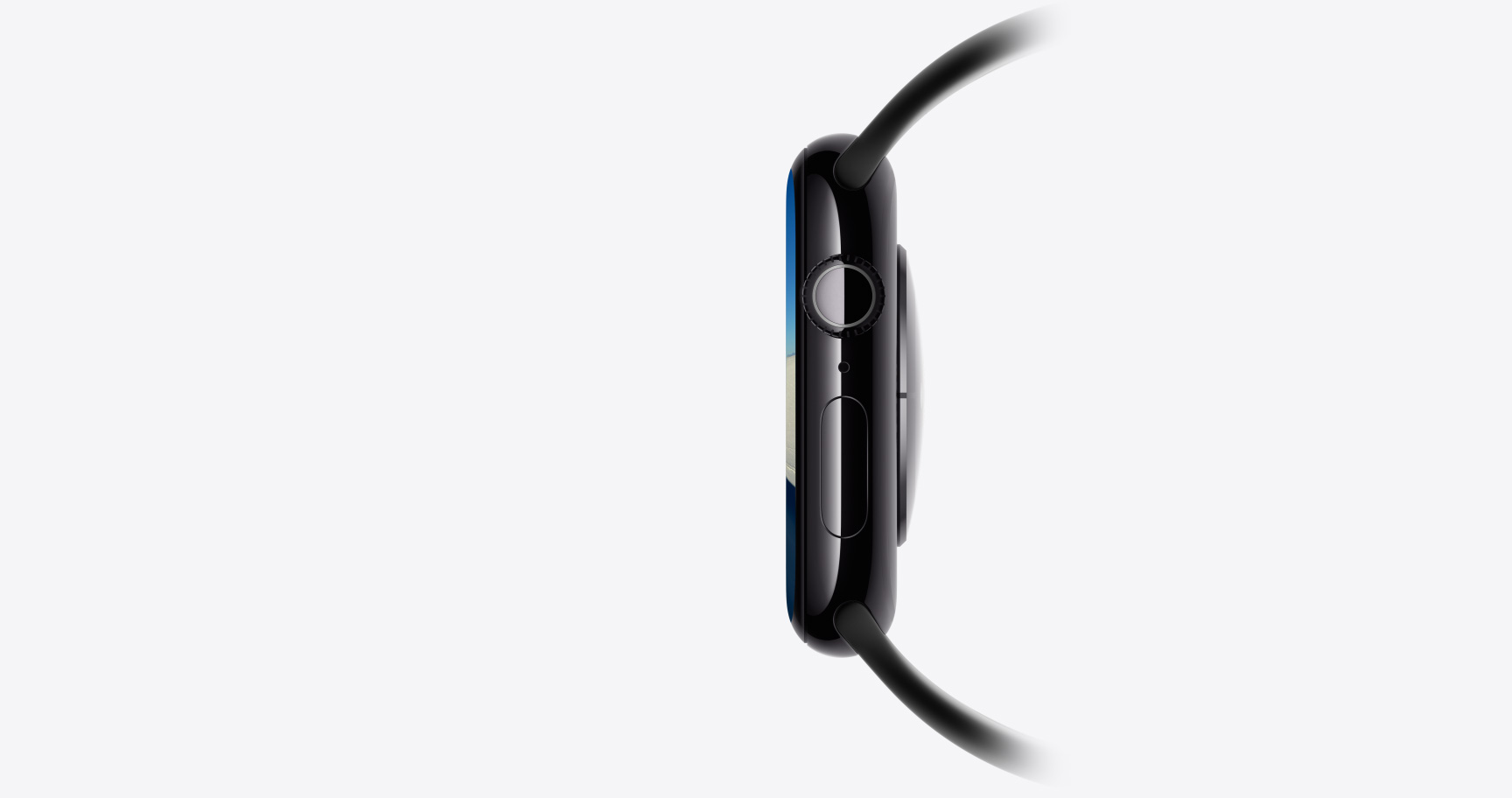 Apple Watch SE 3, aluminum case, midnight color, Flux watch face, right side exterior, Digital Crown, microphone, side button, midnight Sport Band, midnight pin-and-tuck closure