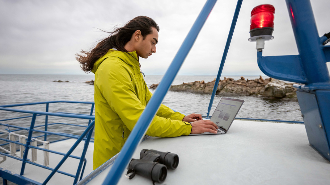 Les technologies Apple aident aussi Bodhi à réaliser et synthétiser ses travaux de recherche universitaire, par exemple lorsqu’il s’agit d’illustrer les effets de l’activité des navires sur la population d’épaulards résidents du Sud – une espèce en voie de disparition – dans la mer des Salish. Équipé de son MacBook Air, de son iPhone et de ses jumelles, Bodhi peut mener son travail de terrain depuis un navire. Il consigne dans Numbers les endroits où des épaulards ont été observés, puis utilise Keynote pour créer des diagrammes et des cartes de densité montrant les endroits où les animaux traversent les secteurs les plus fréquentés par les traversiers, ce qui permet de mieux cerner les risques de perturbation de ces populations. Bodhi se sert aussi d’iPhone pour prendre des photos et enregistrer des vidéos à l’appui de ses observations.