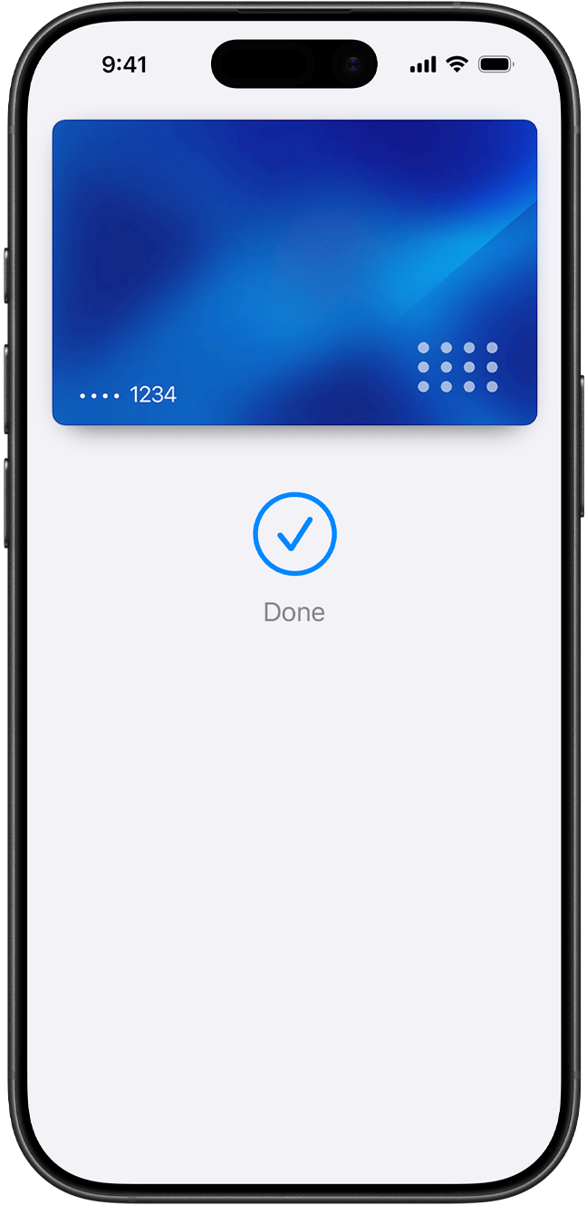 • Kreditní nebo debetní kartu přidáš jednoduše tak, že otevřeš aplikaci Peněženka, klepneš na plus a přiložíš vyhovující kartu k zadní straně iPhonu.1 Nebo můžeš kartu přidat ručně – otevři aplikaci Peněženka, klepni na plus a postupuj podle pokynů na obrazovce. Zadané údaje budeš muset ověřit u své banky nebo vydavatele karty. Pokud máš spárované Apple Watch, rovnou dostaneš možnost přidat kartu i do hodinek. A když si pořídíš nový iPhone, svoje karty do něj přeneseš jedním snadným krokem.