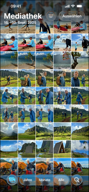 iPhone 17e, Vorderansicht, zeigt viele Fotos in der Fotomediathek