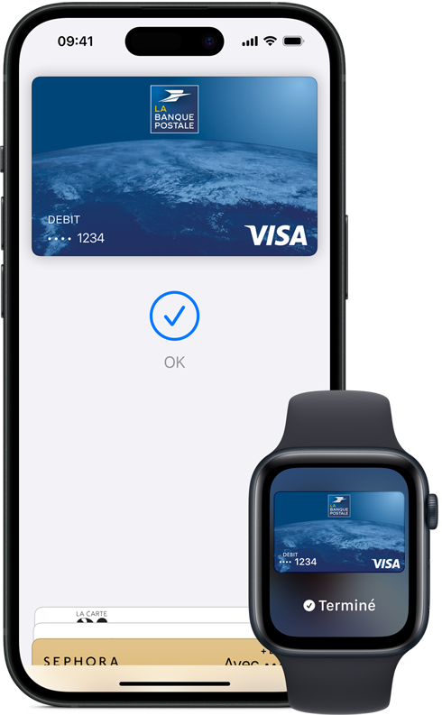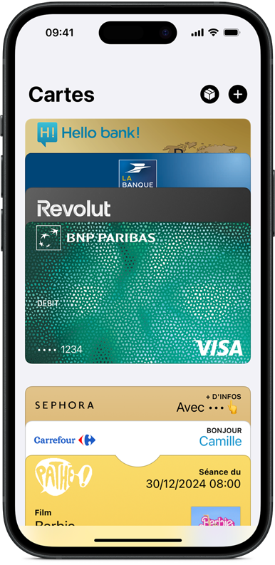 • C’est tout simple. Il vous suffit d’ajouter votre carte de crédit, de débit ou carte prépayée dans l’app Cartes sur votre iPhone. Veillez également à ajouter vos cartes à tous les autres appareils Apple que vous souhaitez utiliser avec Apple Pay. Ce service fonctionne sur iPhone, Apple Watch, Mac, iPad ou Apple Vision Pro. Si vous passez à un nouvel iPhone, vous pouvez automatiquement y transférer vos cartes en une seule étape simple.