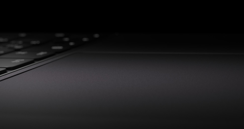 横向きのiPad Pro、上部の側面からの外観、カラーはスペースブラック。Magic Keyboardを取りつけた状態、前面の外観、横向き。ブラックカラーのバックライトキー、専用のファンクションキー列。escapeキー、tabキー、caps lockキー、shiftキー、controlキー、optionキー、shiftキー、deleteキー、returnキー、逆T字型の矢印キー、内蔵トラックパッド