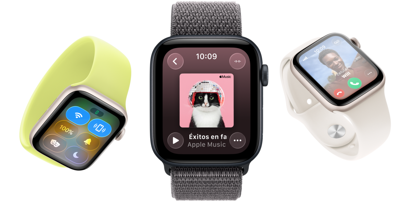 Apple Watch SE 3 con cajas de aluminio disponibles en los colores blanco estelar y medianoche, con apps como Signos Vitales, Frecuencia Cardiaca, Puntuación de Sueño, círculos de Actividad y llamada entrante