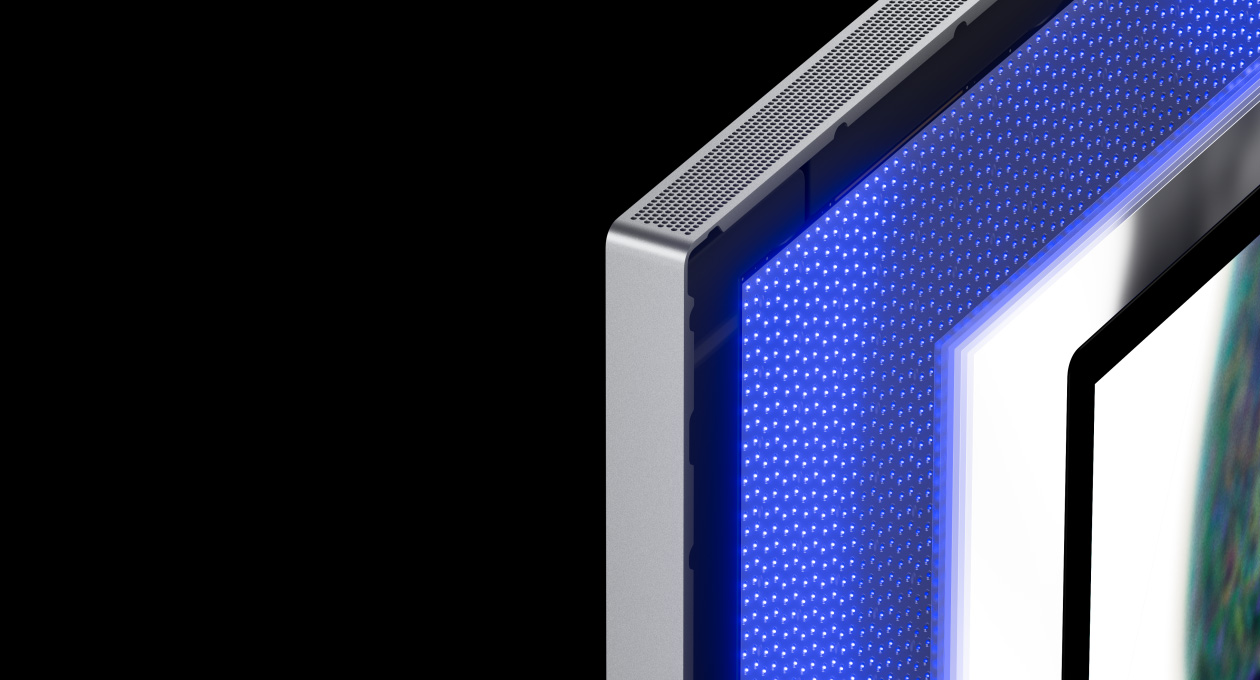 Studio Display XDR má 12 Mpx kameru Center Stage s pôsobivou kvalitou obrazu a väčšou citlivosťou pri slabom svetle. Udrží ťa v zábere, aj keď sa pri videohovore pohybuješ sem a tam alebo sa v zábere objaví niekto ďalší. Pomocou funkcie Pohľad na stôl môžeš ukázať, čo máš na stole, a zároveň zostať v zábere. A Okrajové osvetlenie vytvára okolo displeja virtuálne kruhové svetlo, ktoré ti nasvecuje tvár.