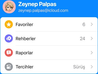 Tercih edilen ulaşım biçimi, bildirilen sorunlar ve favoriler gibi en çok kullandığınız ayarların tümünü tek bir yerden görüntülemek için Harita’yı açıp ekranın alt kısmındaki kullanıcı hesabı fotoğrafınıza dokunun. Harita’yı aygıtlarınızda veya CarPlay ile araç ekranınızda açtığınızda en sık ziyaret ettiğiniz yerler gösterilir. Böylece ev, iş yeri, spor salonu, çocuğunuzun okulu, en yakın benzin istasyonu veya favori restoranınız her zaman yalnızca bir dokunuş uzağınızda olur.