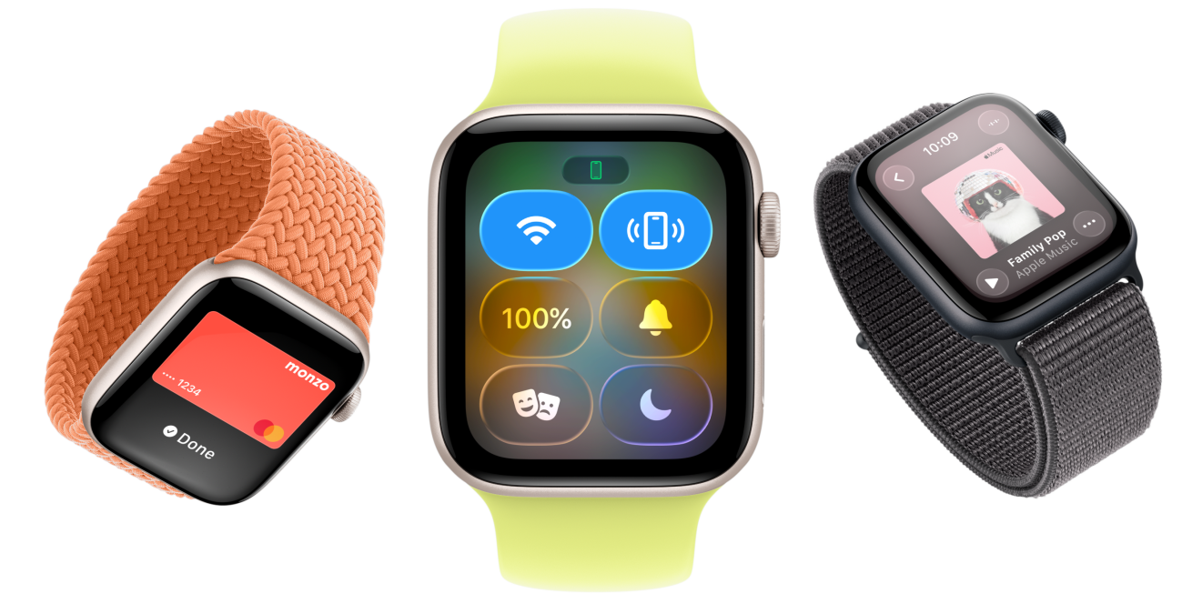 Apple Watch SE 3 devices, aluminium cases, starlight and midnight colours, Braided Solo Loop, turmeric colour, Solo Loop, neon yellow colour, Sport Loop, dark grey colour, screens: Apple Pay, Control Centre, Apple Music